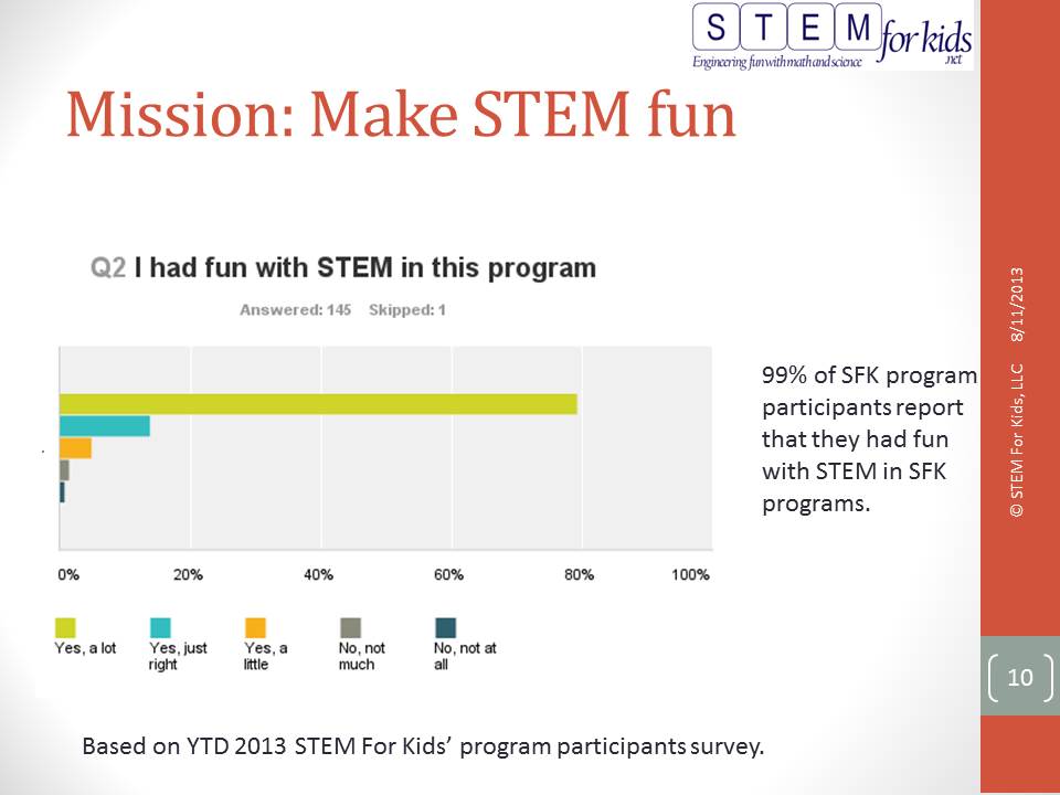 Many of my past colleagues from industry and corporations ask me, “I know my stuff, I am an expert in what I do … however, how do I explain it to kids in a fun way?” Yet, as I discussed in my earlier post The Big Bang Theory of STEM, fun is an important and critical ingredient of a STEM program geared for kids. Results from our camper survey shows that STEM For Kids’ (SFK) is excelling on this front …